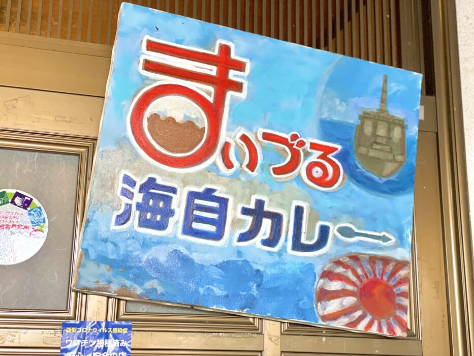 お店の玄関では『まいづる海自カレー』のイラストボードがお出迎え!よく見ると手描き😳✨