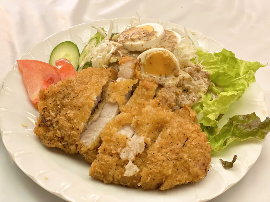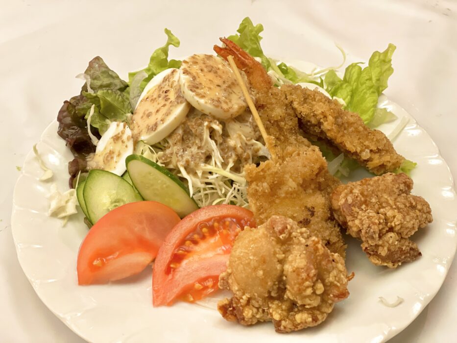ゴマだれのかかった新鮮なサラダとカラッと揚げられた揚げ物たち。カレーの上に乗っているのではなく、お皿が別で提供されるので両方の味をしっかりと味わいながらいただくことができます🙏🏻