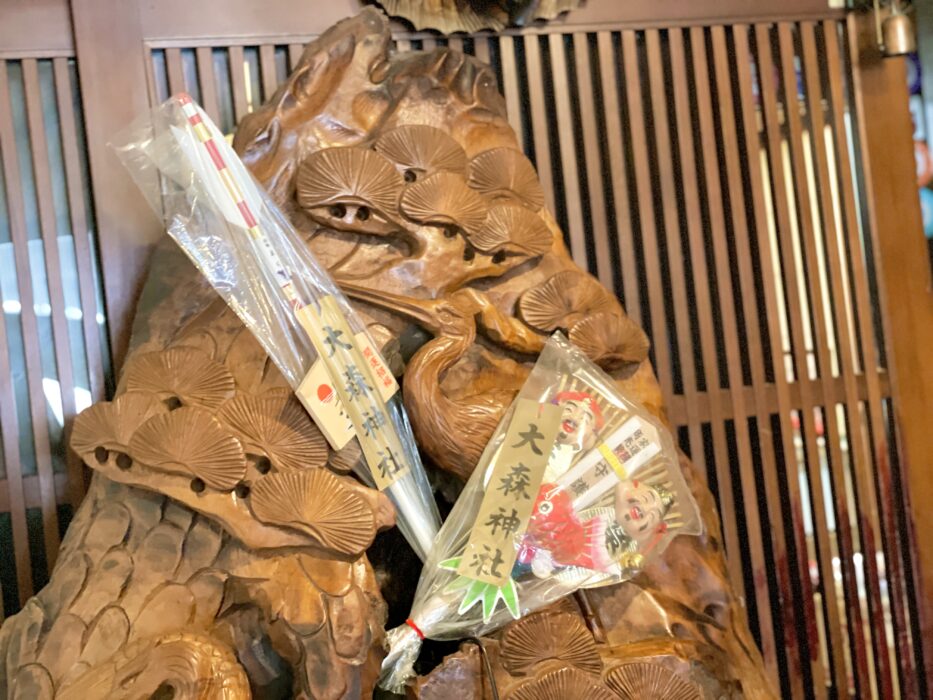 大きな木彫りの置物には旧海軍・駆逐艦『菊月』の砲身が奉納されている『大森神社(彌加宜神社)』の破魔矢と熊手が飾られていました💡