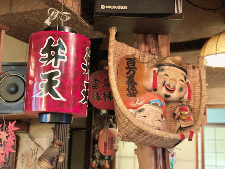 玄関から客席までに飾られている品々、弁天の提灯風ライトや七福神の大黒天様のお面が一際目を惹きます👀✨