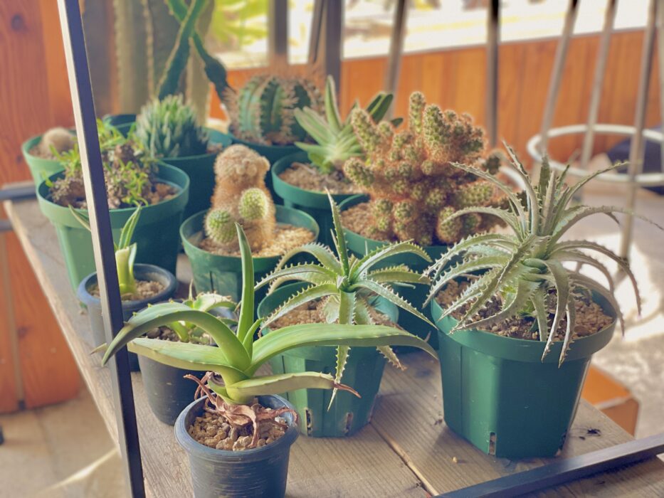 入口付近に飾られている植物やユニークなサボテンたち🌵