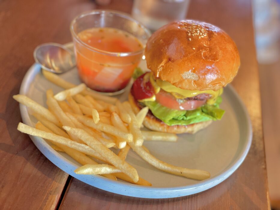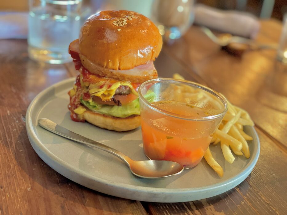 どちらもバンズの幅より全体の高さの方が大きい…!?付け合せのスープやフライドポテトとの相性抜群のハンバーガーです✨