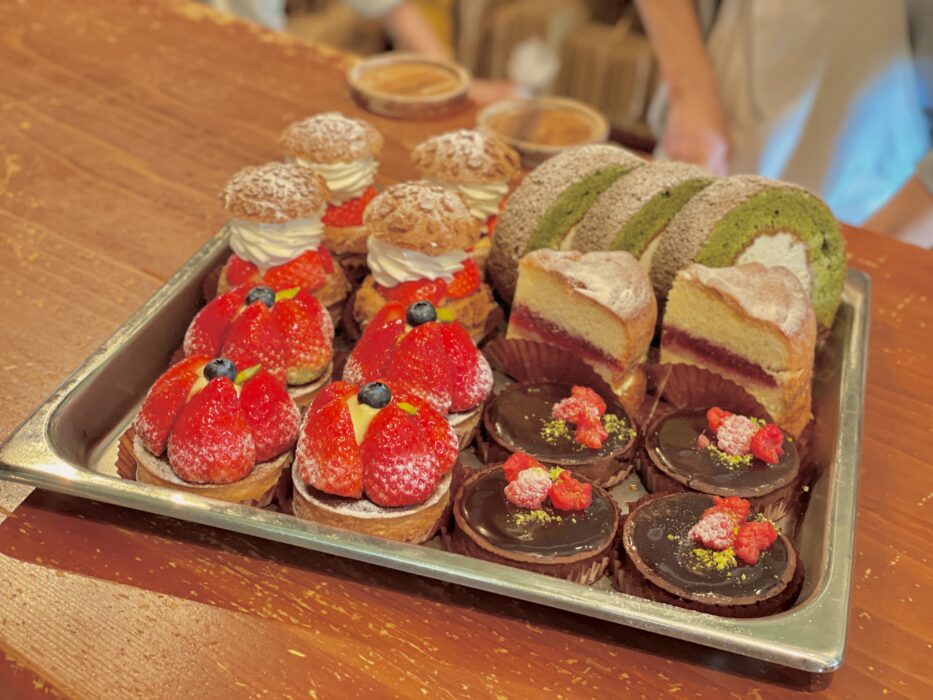 木枠のショーケースの中にはフルーツタルトや大人気のカヌレが並んでいます✨
