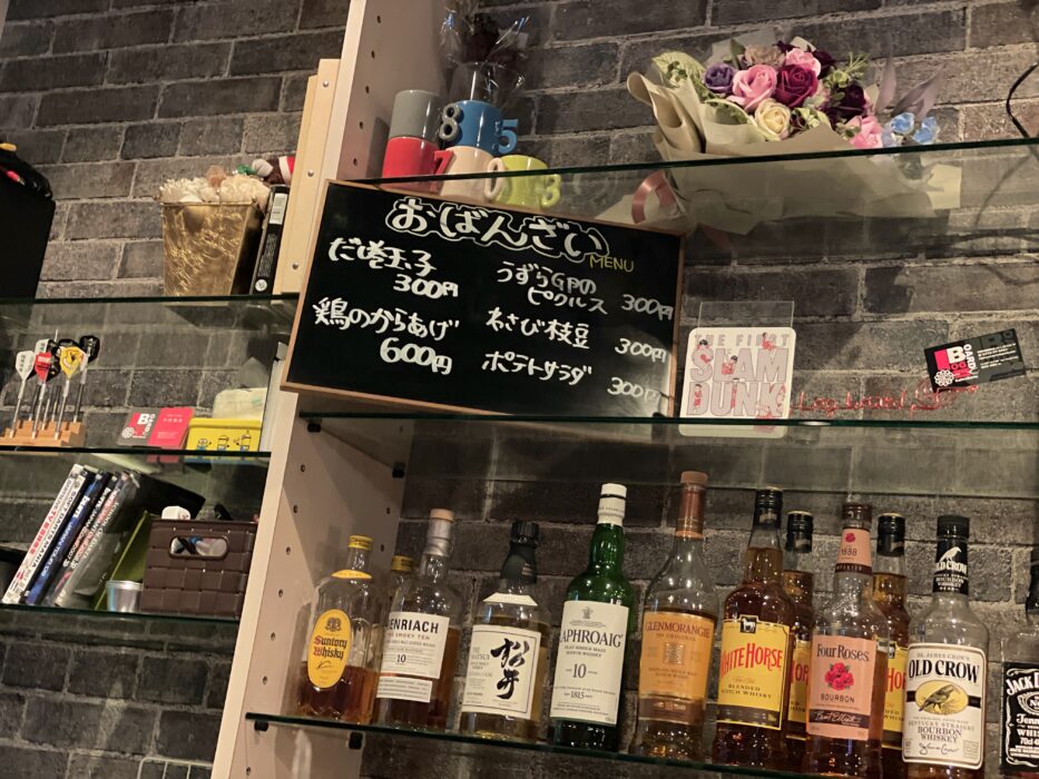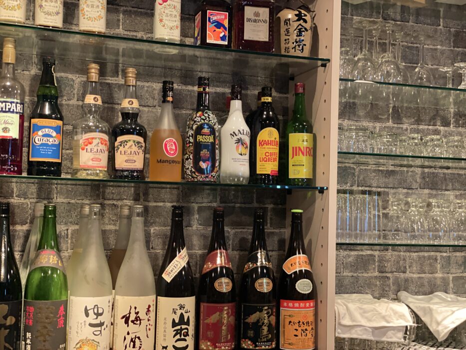 壁にずらっと並んだお酒やカウンター上の小物類が可愛い✨️