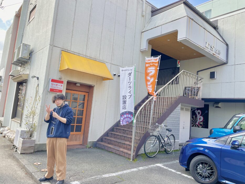 お店に上がる階段にはのぼりが飾られています💡ビルの前には数台分の駐車場がありますし、敷地の横には市営駐車場もあるので、車を止める場所にはまず困らないですね!🚗