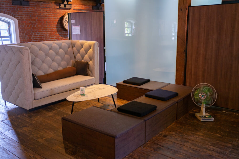 ちょっと休憩用? ホテルのラウンジにありそうな雰囲気ですが、隣の扇風機のレトロ感。