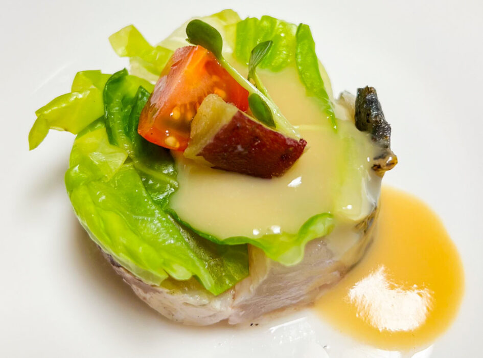 まずは前菜として、春キャベツとサワラの和物。一見すると洋風っぽくも見えますが、ソースは白味噌で見た目も食欲をそそります。
