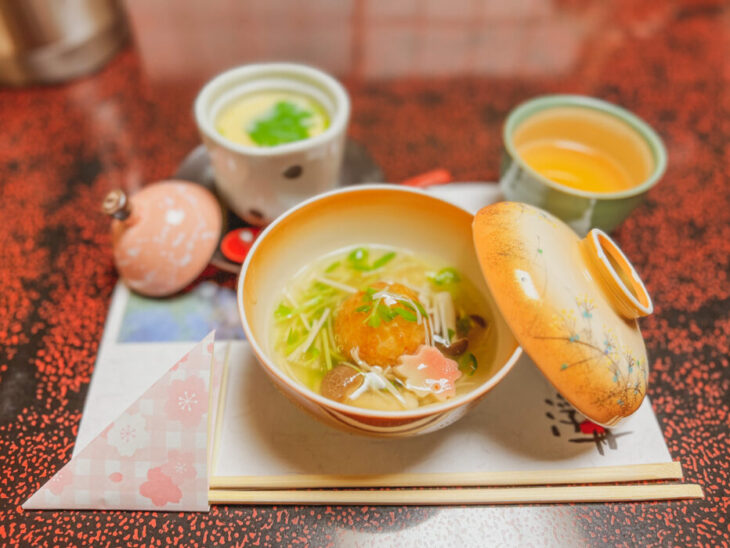 芋餅のお吸い物(とろみ餡仕立て)。茶碗蒸しと同様、いいお出汁のお吸い物で、芋餅が食感を引き立てます。