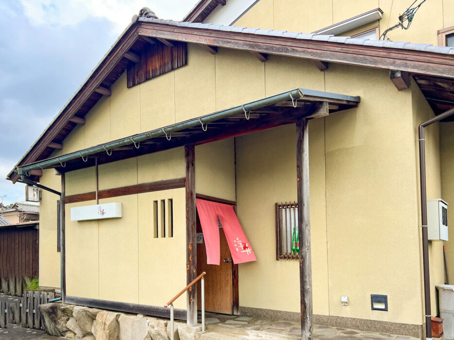 住宅街の中にふわっと存在感を見せる佇まいと赤い暖簾が目印。