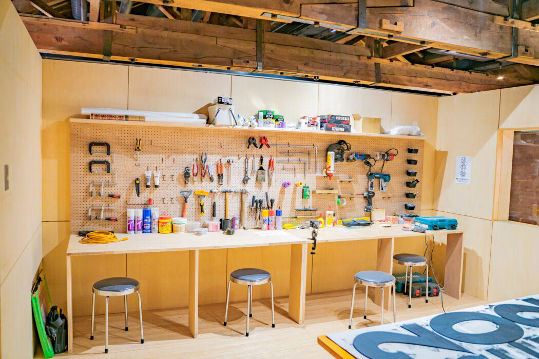 工作室。マキタの工具などが並びます。もちろん利用者登録をしていれば、こちらの工具全て使えます。