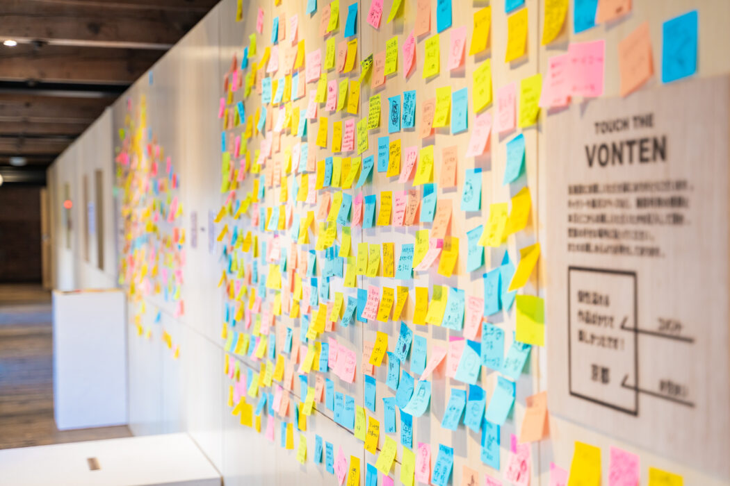 山側入口から入るとすぐに見えてくる来訪者のコメントスペース。ただ付箋を貼るだけでもこんなにおしゃれにできるのかと。