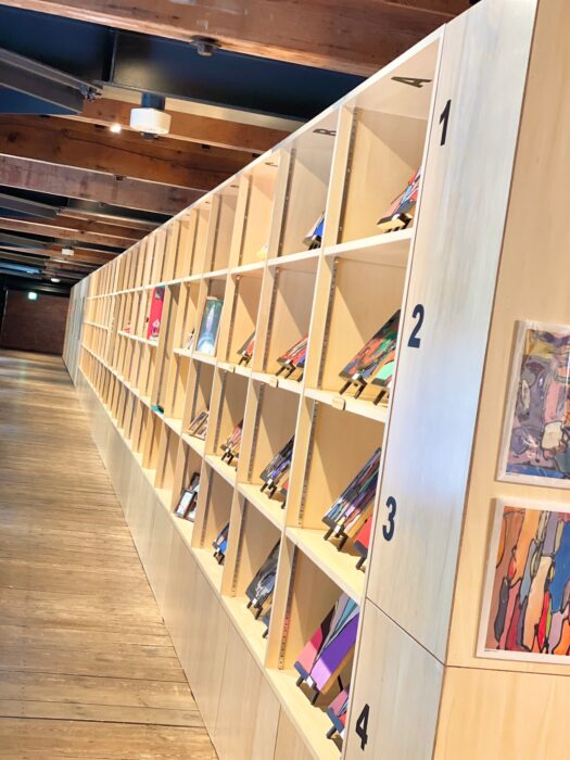 オフィスの海側(北側)入口からは、長い廊下に沿って巨大な棚がお目見えします。