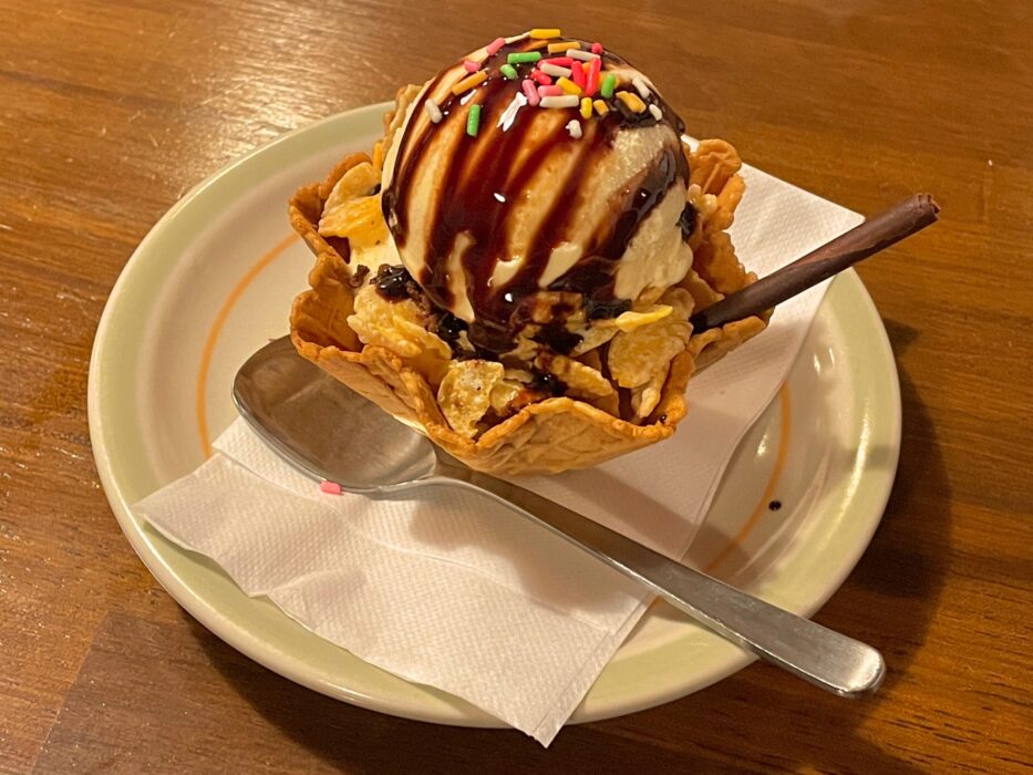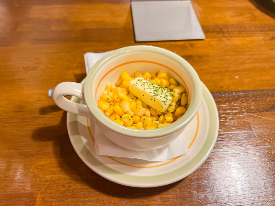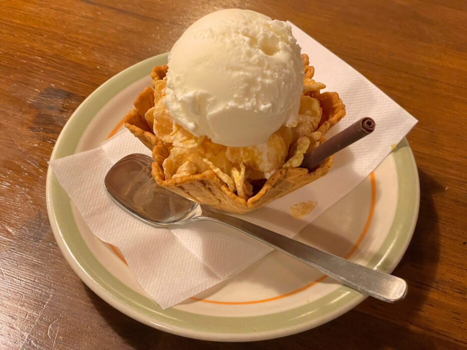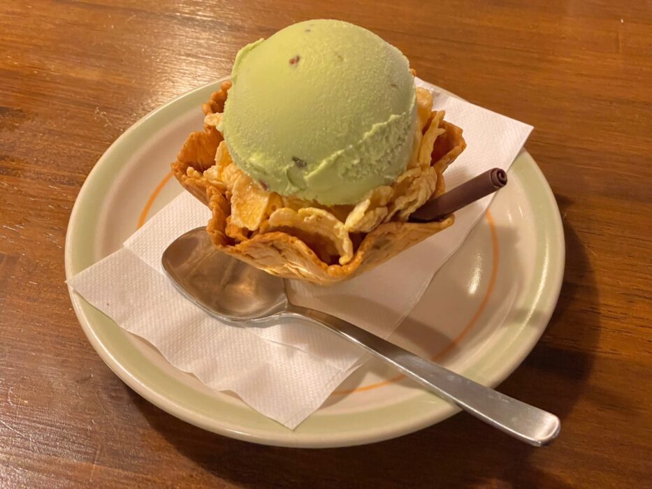 最初ココナッツミルクはバニラか普通のミルクだと思っていたのですが、一口食べてみると「あれ?」となる新鮮なびっくり感。コーンの器嬉しいです。
