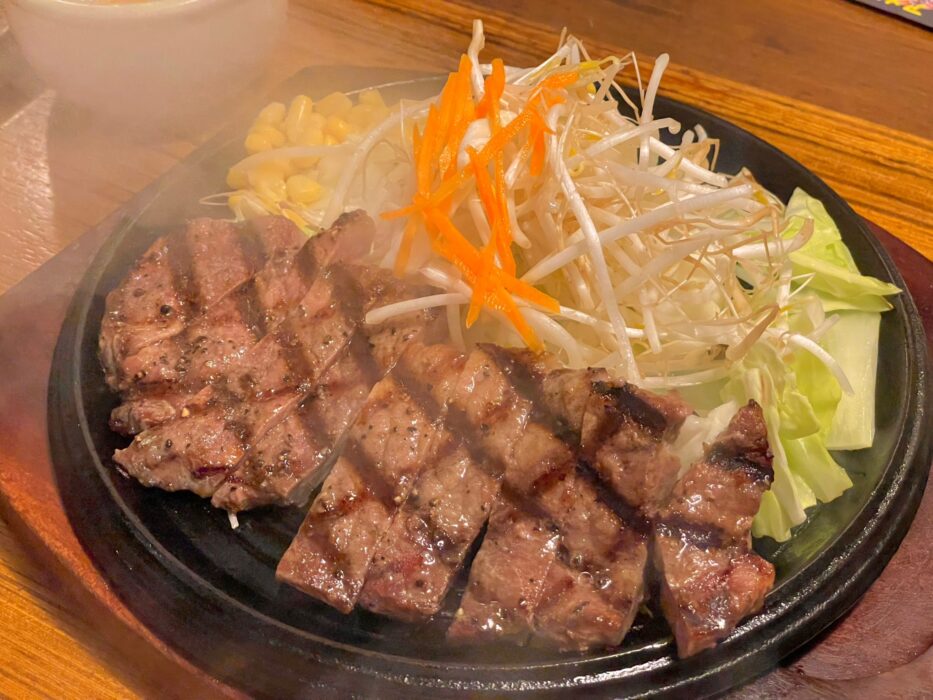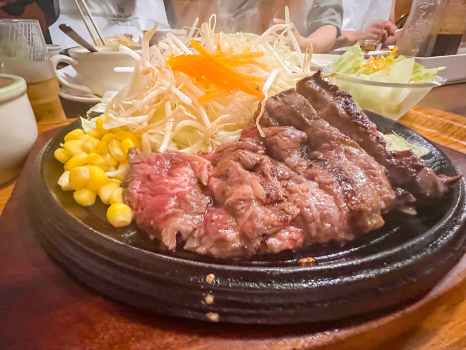 野菜たっぷりで届きます。鉄板がものすごく熱いので注意ですが、肉は気持ちレアめに焼かれているので、鉄板が熱いうちに好みの焼き具合にしてしまいましょう。
