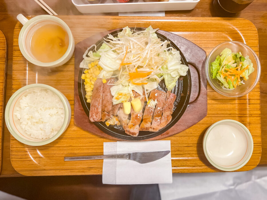続きましてはポークステーキ。2枚目の写真は全景ですが、他のメニューも全てライスとサラダ込みです。