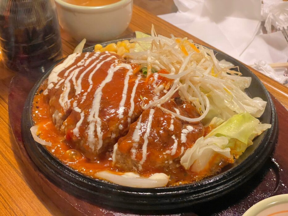 こちらも定番の焼きたてハンバーグ。ソースのぐつぐつ感がたまらんのですよ。