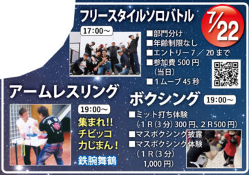 そして四条付近ではアームレスリングが復活!19:00〜で、ちびっこ力自慢による大会が開かれます。こちらも興味ありますね!また、ボクシングのミット打ち体験やマスボクシング体験もあります。