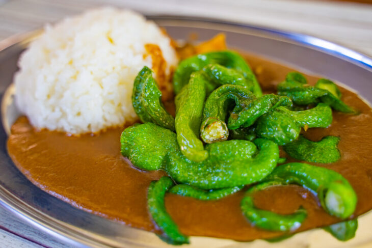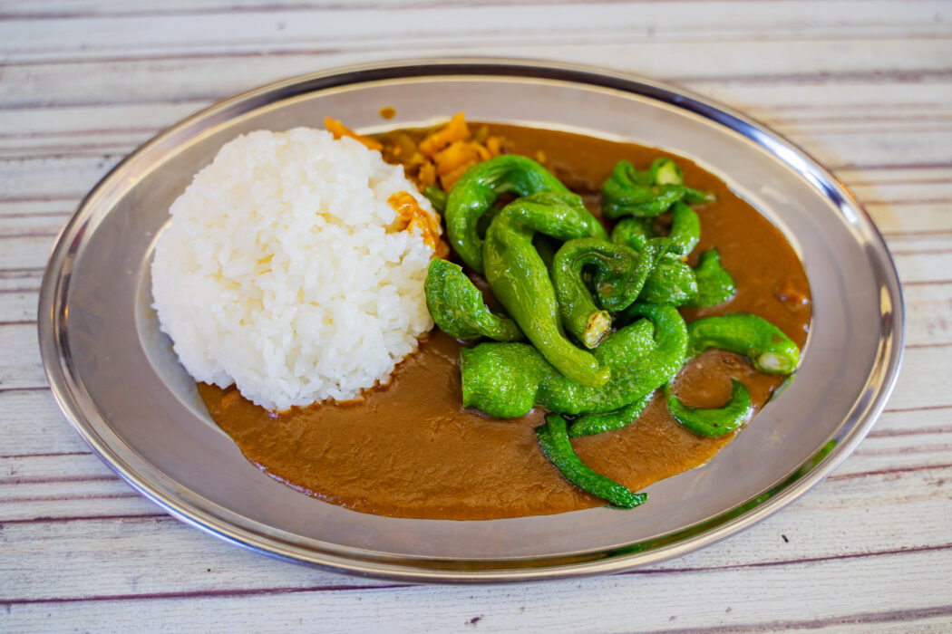 舞鶴が産んだ京野菜でおなじみ「万願寺甘とう」のカレー。名前の通り「甘とう」なので、とうがらしですが辛くありません。
