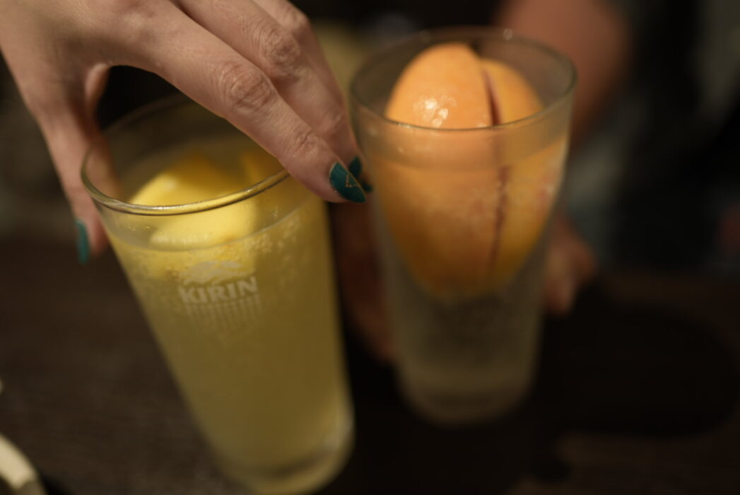 透明な枡に注がれた日本酒や、瑞々しいフルーツの入ったサワーなど、見た目も素敵なお酒たち。