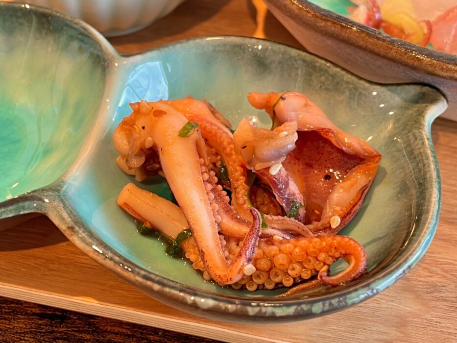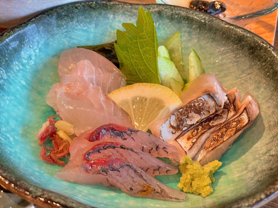 まずはお刺身。旬のお魚が揃っています。個人的に鰆の炙りが好きなんですけど、お魚なのにフルーティみたいな、自分でも何言ってんのかわかんないやって感想ですが、新鮮な魚だからこそ感じられる食感が最高です。