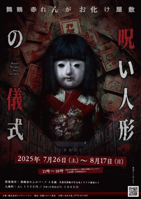 昨年舞鶴の夏を恐怖で彩った「舞鶴赤れんがお化け屋敷 戦慄の白衣」ですが、2025年7月26日より、最強お化け屋敷「呪い人形の儀式」が開催されました。昨年は赤れんが5号棟の1/4スペースを使っての開催でしたが、今年はさらにグレードアップし、赤れんが4号棟の半分を使ってより広いスペースでの開催となります。