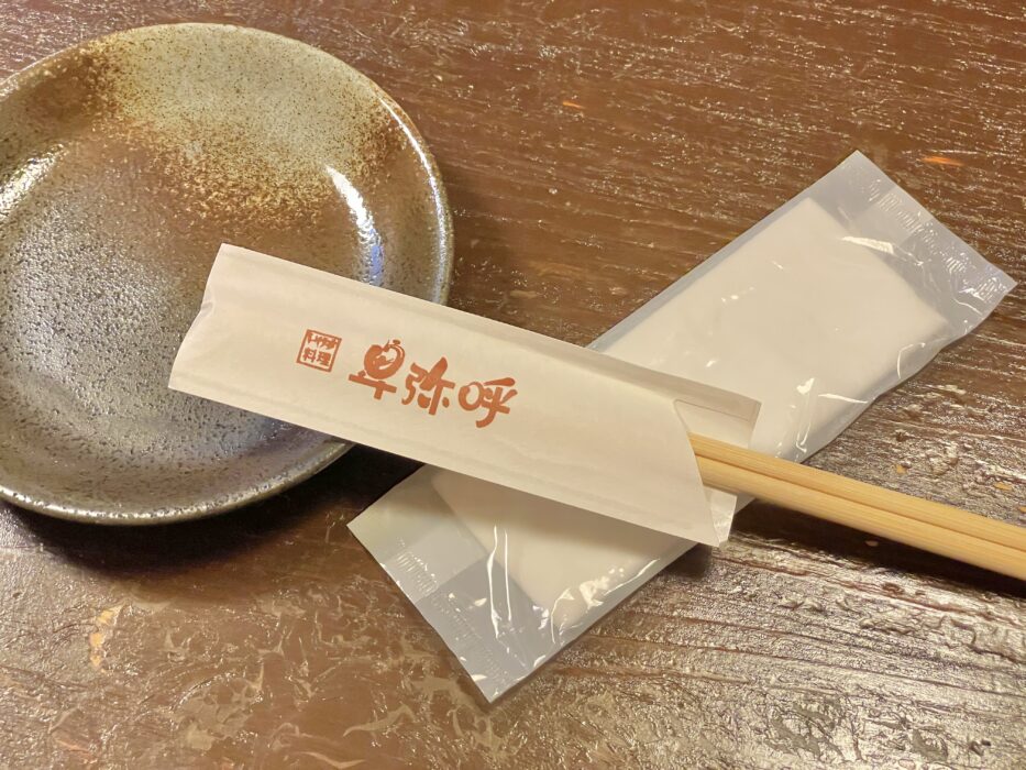 お店の名前が入ったお箸と取り皿、お手拭きのシンプルなセット。