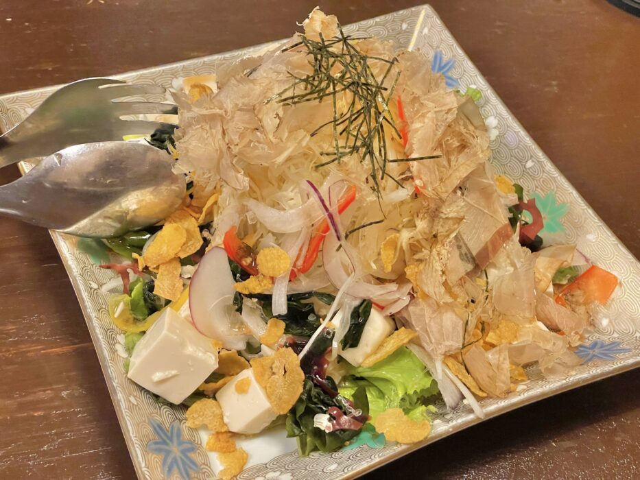 『豆腐と海藻のヘルシーサラダ』。どうしても濃い味のものを頼みがちなのでここはさっぱり味で。