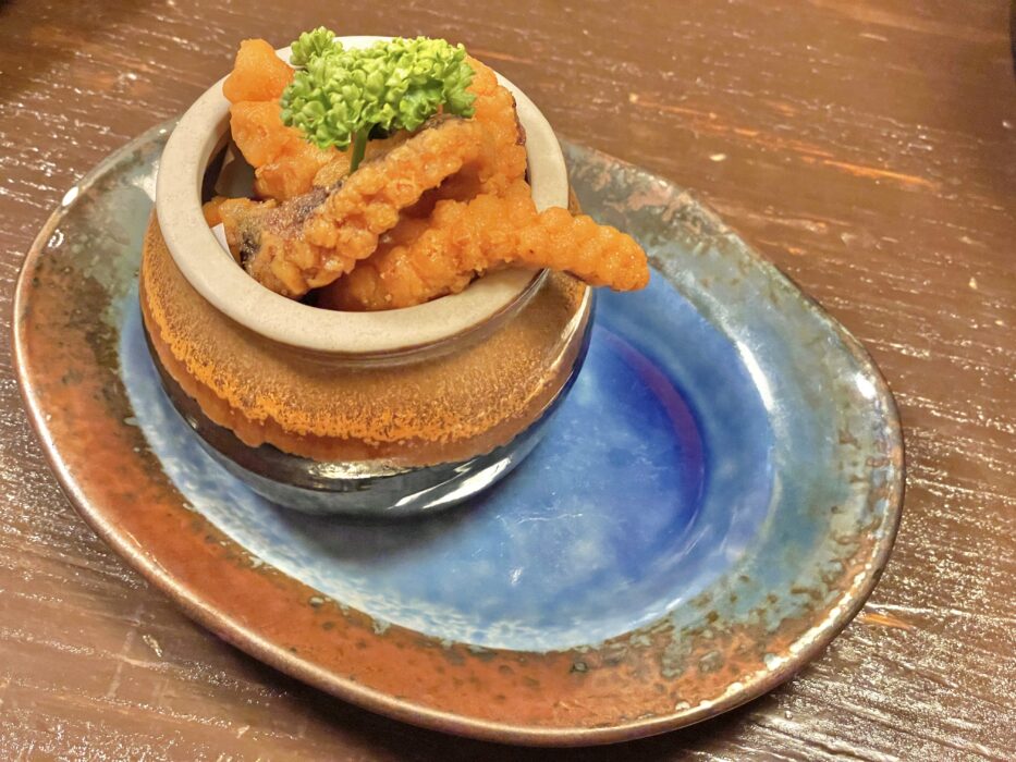 『真だこの唐揚げ』。入れ物が蛸壺みたいで可愛い✨勿論ぷりぷり!