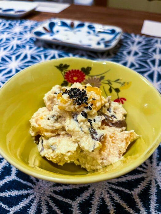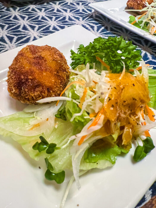 カボチャコロッケ。カボチャがびっくりするくらい甘くて、一品メニューなのにスイーツ感。揚げたてなのでホクホクです。