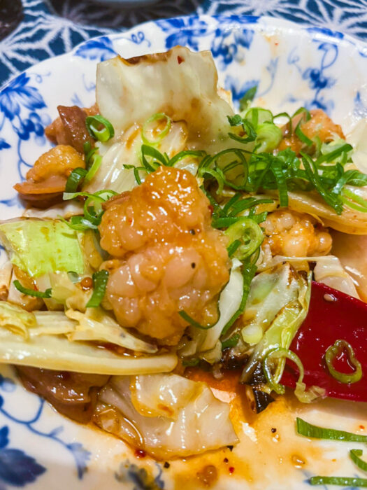 ホルモン焼き。野菜炒めとホルモンの相性ってなんでこんないいんですかね…。見た目よりも脂っこくなく食べやすかったです。