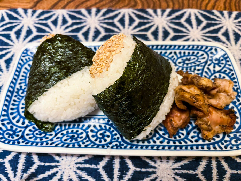からの、おむすび。具材はもろみでした。となりの鶏肉は柚子胡椒で。