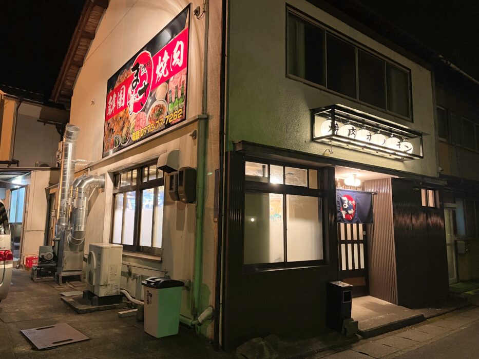壁面に掲げられた大きな看板と”焼肉ホルモン”の提灯が目印👀🐮