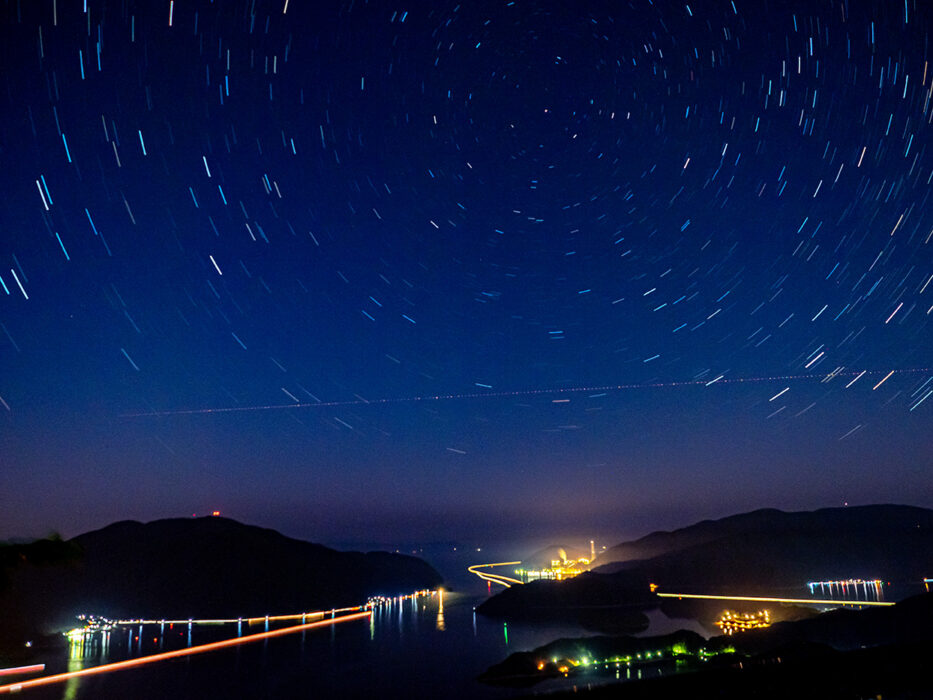 五老スカイタワーから観る夜景と星空。これは過去にも紹介した写真ですね。地味に夜景のピントがズレてて、次回に期待。