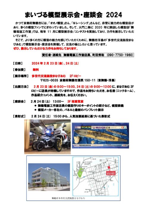 そこで、年例行事として、より多くの方に模型の魅力を感じていただくために、舞鶴市浮島の市民病院跡に開設された多世代交流施設まなびあむで、模型展示会および模型メーカーのパネル等の展示、そして模型作りのキーポイントを紹介する、座談会を開催して、交流の場としたいと思っています。