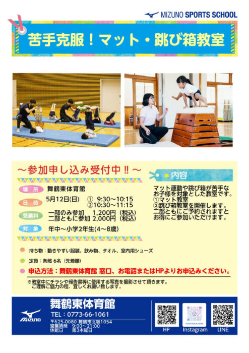 舞鶴東体育館にて苦手克服!マット・跳び箱教室を開催します。