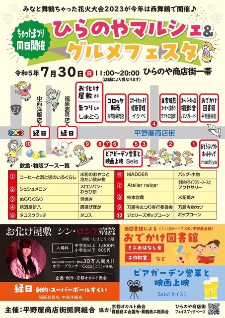 7月30日(日)みなと舞鶴ちゃった花火大会が西舞鶴で開催されます。そちらに合わせてひらのや商店街では既存店舗とともにキッチンカーなどのご出店をいただき「ひらのやマルシェ&グルメフェスタ」を開催します。