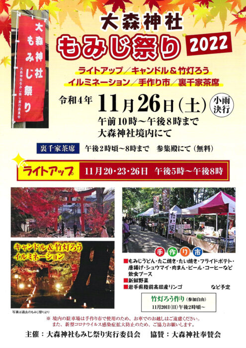 26日はもみじうどん・たこ焼き・たい焼き・フライドポテト・唐揚げ・シュウマイ・肉まん・ビール・コーヒーなどの飲食ブースのほか、新鮮野菜、岩手県陸前高田産リンゴの販売なども予定されています。