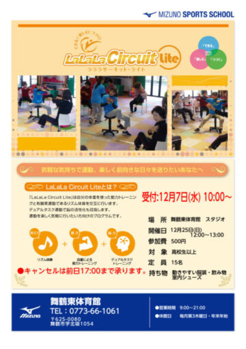12月25日(日)12:00~13:00に舞鶴東体育館スタジオルームにてラララサーキット・ライトを開…