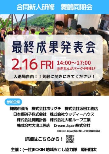 舞鶴同期会の合同新人研修最終成果発表会を開催します。 入退場自由!気軽に聞きにきてください!