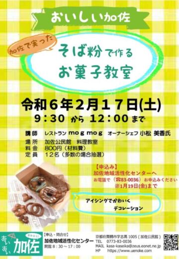 『そば粉で作るお菓子教室』 日時:令和6年2月17日(土)9時30分〜12時 場所:加佐公民館 …