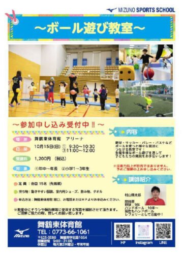 いつもスポーツ施設をご利用いただき、誠にありがとうございます。 舞鶴東体育館にてボール遊び教室を開…
